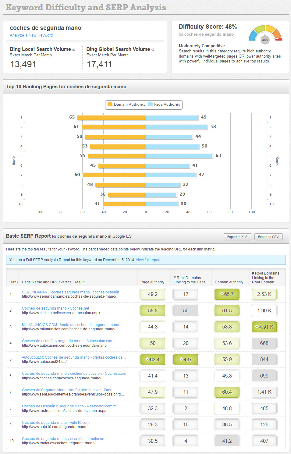 Otra herramienta que te permite valorar la “potencia” de tus competidores y por extensión la dificultad de palabra clave es Open Site Explorer. Esta herramienta no sólo te devuelve tus palabras clave con los datos de dificultad de palabra clave en %, sino que te ofrece además informes con los datos de los competidores que ha usado para establecer estos valores de dificultad de palabra clave (autoridad de dominio y de página, número y autoridad de los enlaces externos entrantes, métricas de optimización onpage, etc.).