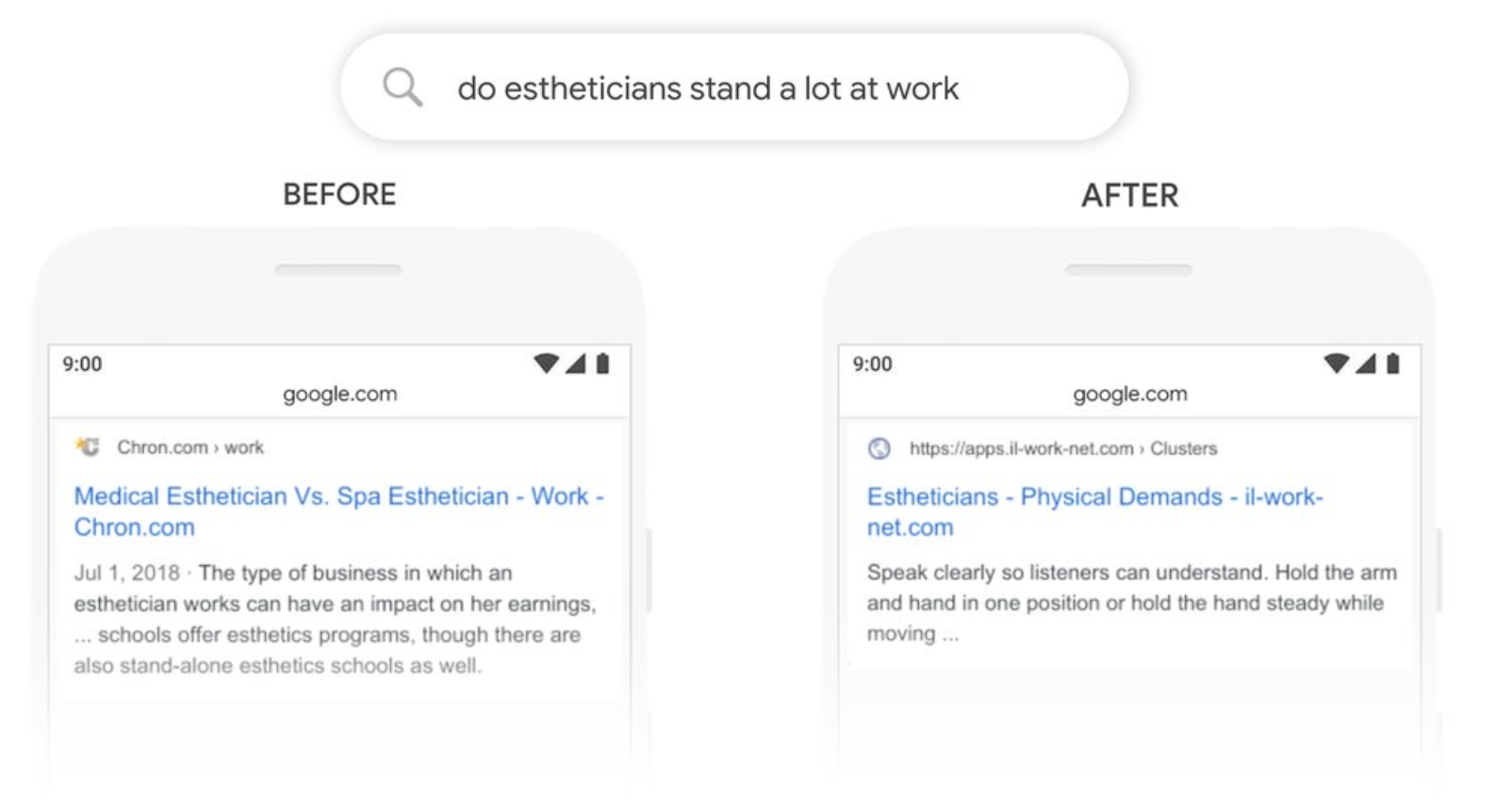 Antes: para la búsqueda “los esteticistas tienen mucho trabajo”, Google combinó las palabras clave “esteticista” y “trabajo”, mostrando un artículo que clasifica bien e incluye ambas palabras clave en el título. Aparentemente incapaz de entender el contexto de la pregunta.