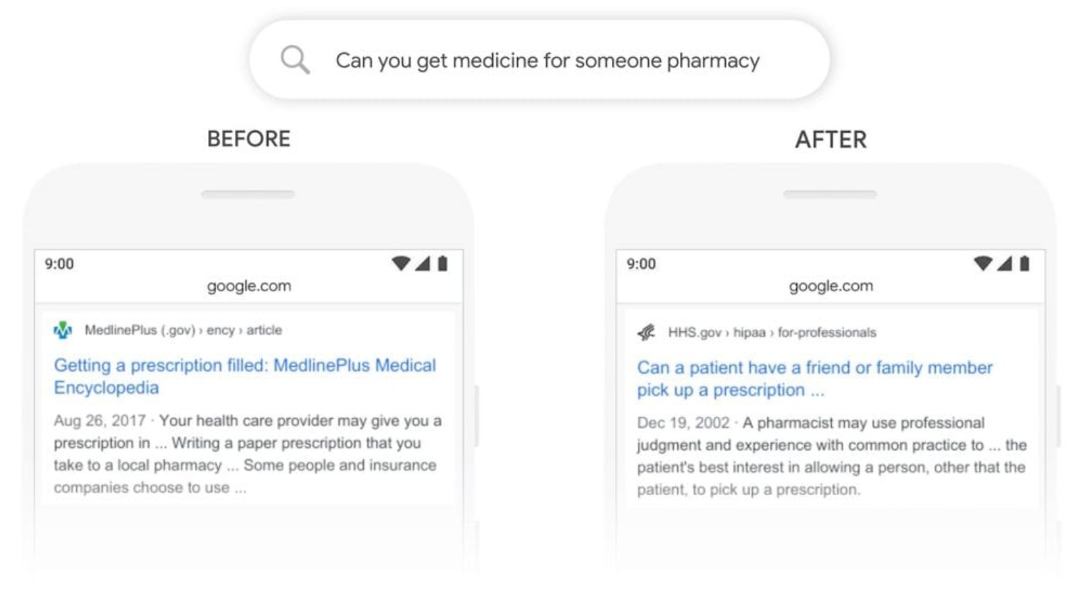 Antes: para la búsqueda “¿Puede obtener medicamentos para una farmacia?”, Google muestra una respuesta destacada que coincide estrechamente con las palabras clave utilizadas en la búsqueda, pero no puede entender el contexto de la pregunta.