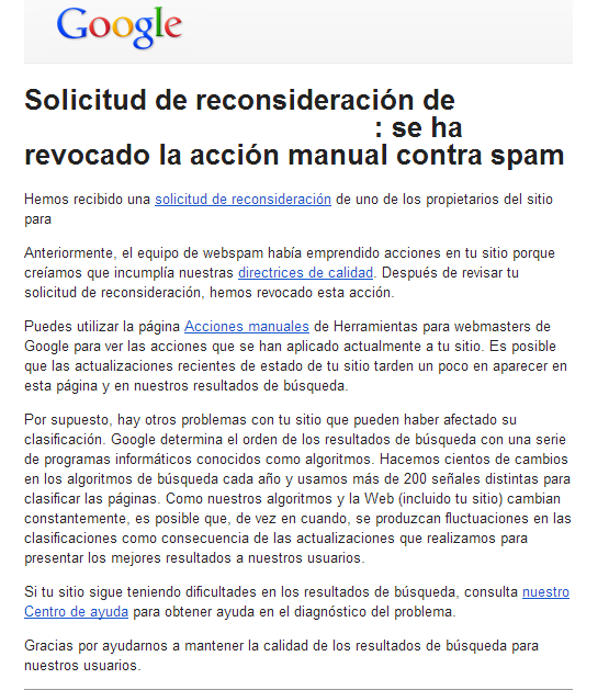 Google tardó aproximadamente una semana en contestar a nuestra solicitud de reconsideración. Si la hubiera denegado nos hubiera contestado afirmando que todavía quedaban enlaces no naturales apuntando a nuestro sitio y nos hubiera mostrado 3 ejemplos pero, por suerte, recibimos el mensaje de la victoria.